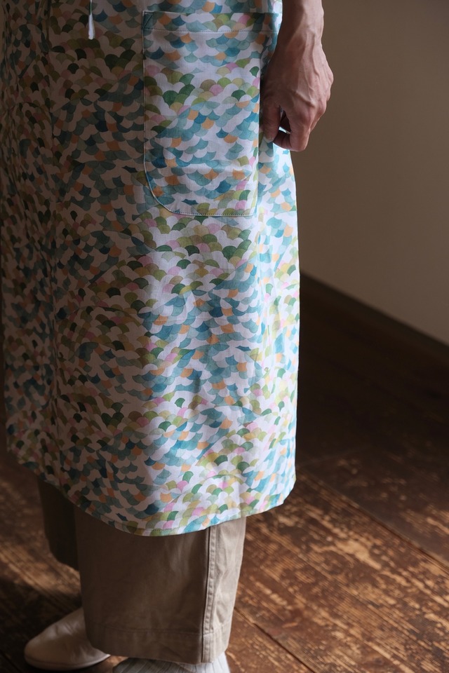 ao ( あお )のオリジナルエプロンです。 シンプルながら印象深い柄、身に着けると魅力が増す一枚です。 少しレトロな落ち着いた色味で、ぱっと見よりも服装を選びません。 軽量ですので長時間の台所仕事にもお勧め。 身に付ける際は、腰紐を後ろで心持ち上に持ち上げながらクロスし、前に持ってきて結び、さらにポケットに手を入れサイドにチョンチョンと広げると“こなれ感”が出ます。 着こなしのコツ、ぜひお試しください。 ※着用モデル 身長160cm ※首ひも結びが右サイドのデザインです。 ※お洗濯の際は必ずネットを使用してください。 ※他の衣類と一緒に洗濯機に入れてOKです。