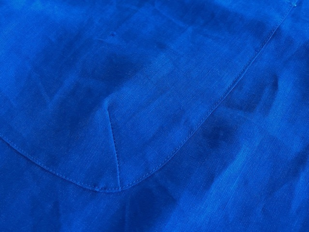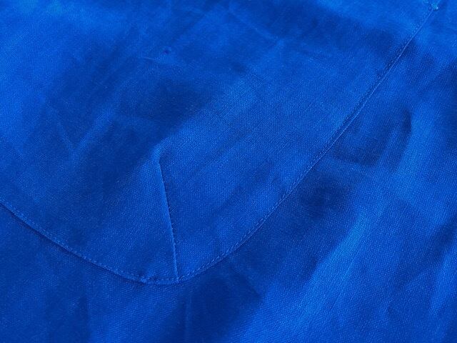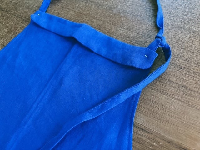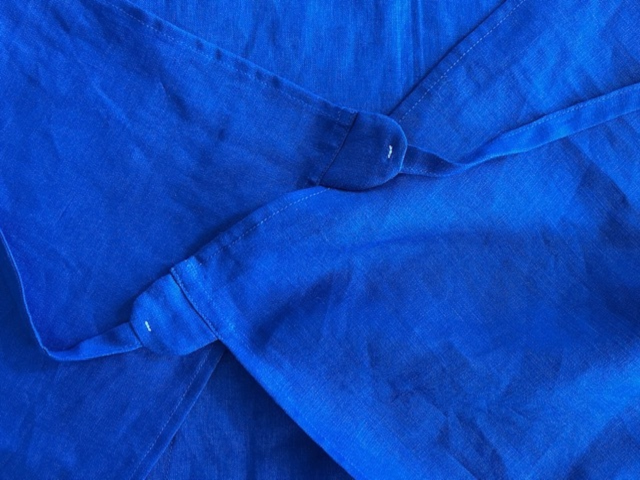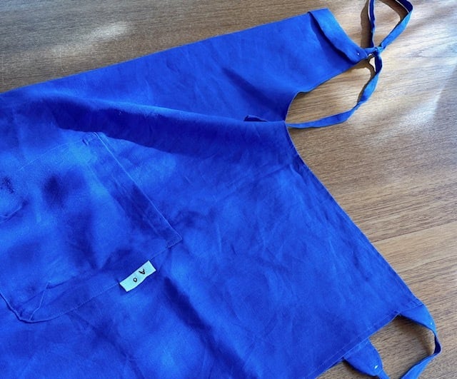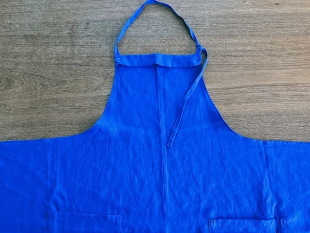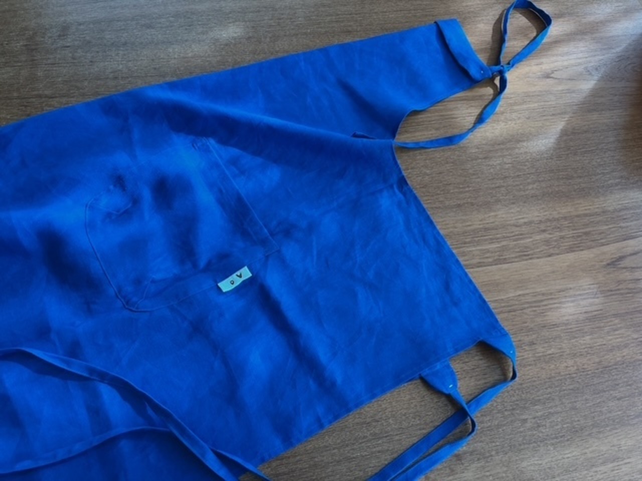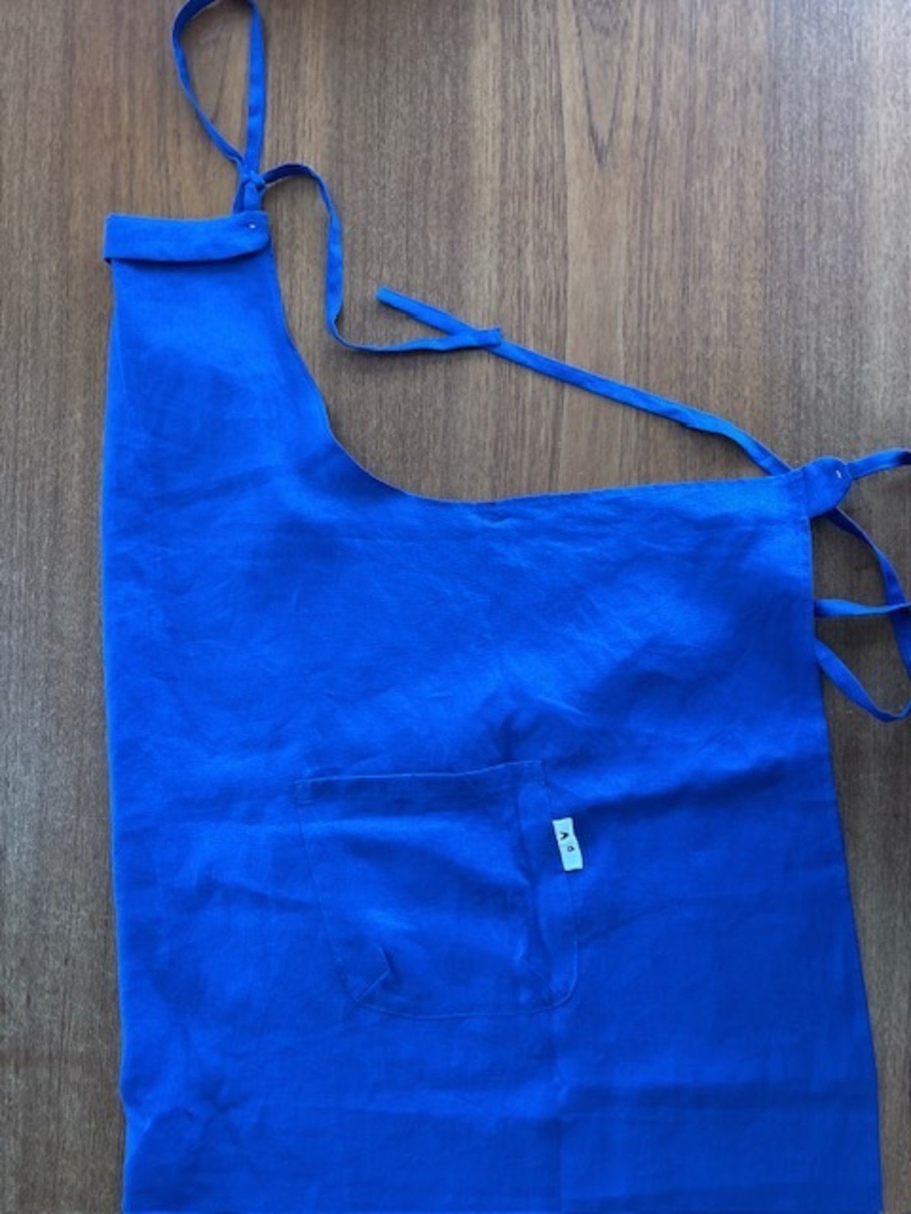 気持ちまで晴れやかになるような青のリネンエプロン。