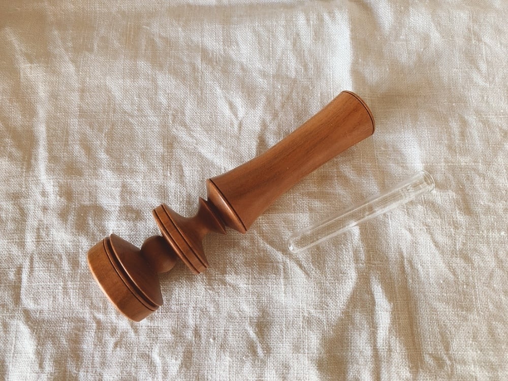 飛騨高山に工房を構え活動されている、岩田翔馬さんと村澤ちなみさんのユニット「osio craft」の一輪挿し。胡桃や桜の木材で作られた作品はどれも違う顔を持つ一点ものです。ドライフラワーを入れても雰囲気たっぷりですが、中にはガラス製の試験管(IWAKI製)が入っているので生花もお楽しみいただけます。どこかしら北欧テイストが感じられるデザインは、お花を入れずに飾っておいてもとても素敵です。