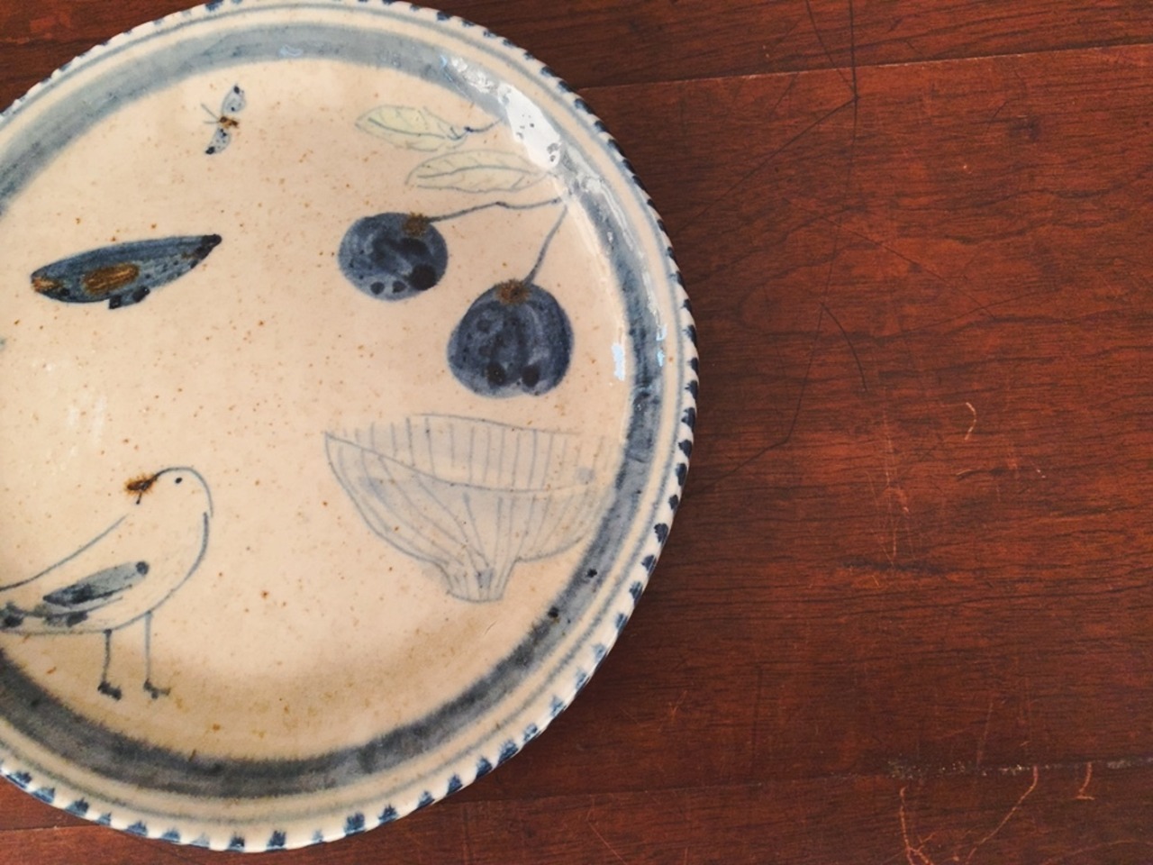 ムーニーともみ「円形皿」B 鳥とさくらんぼ