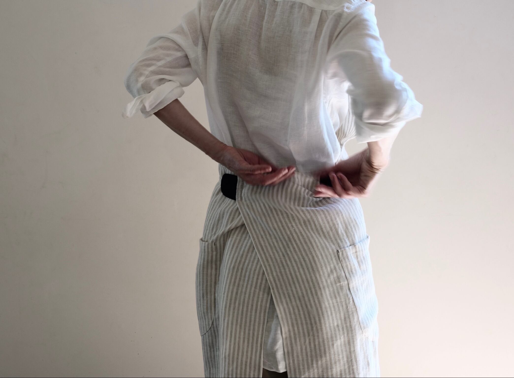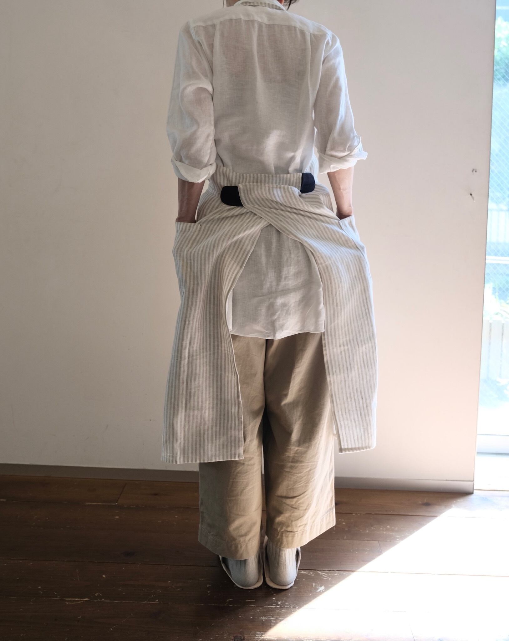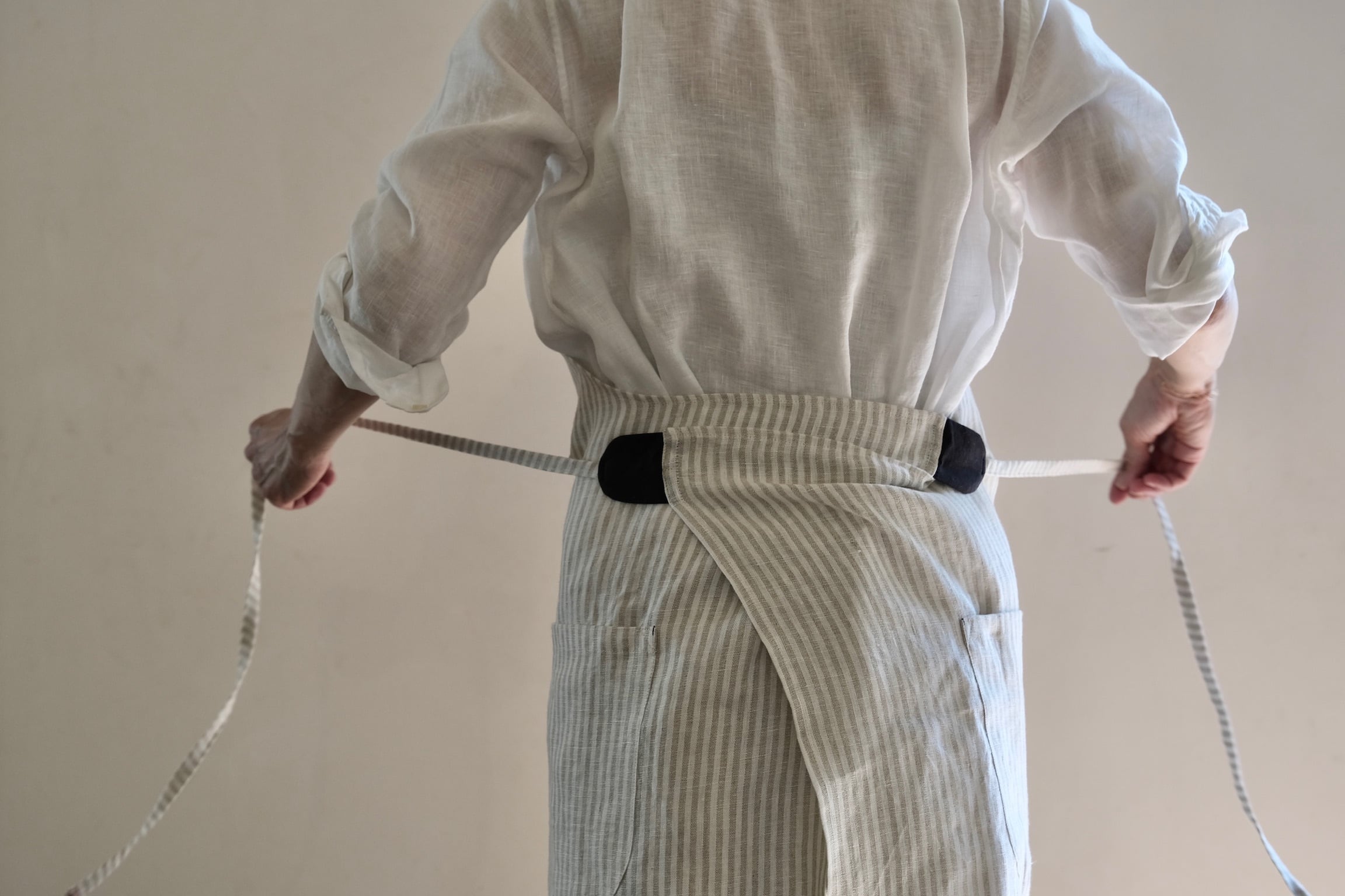 腰紐は、後ろで幾分上に持ち上げながらクロスし、お腹部分で結びます。
