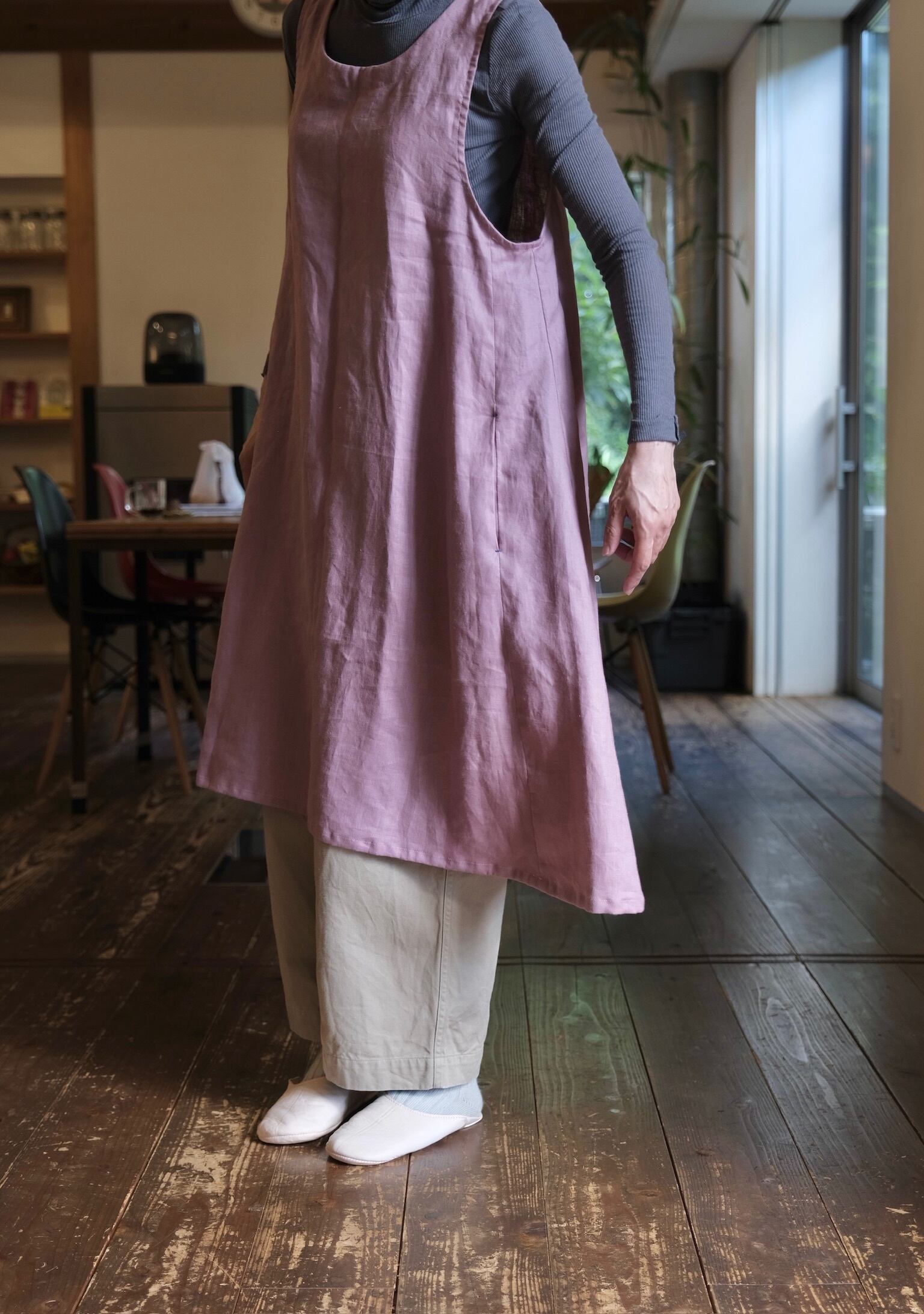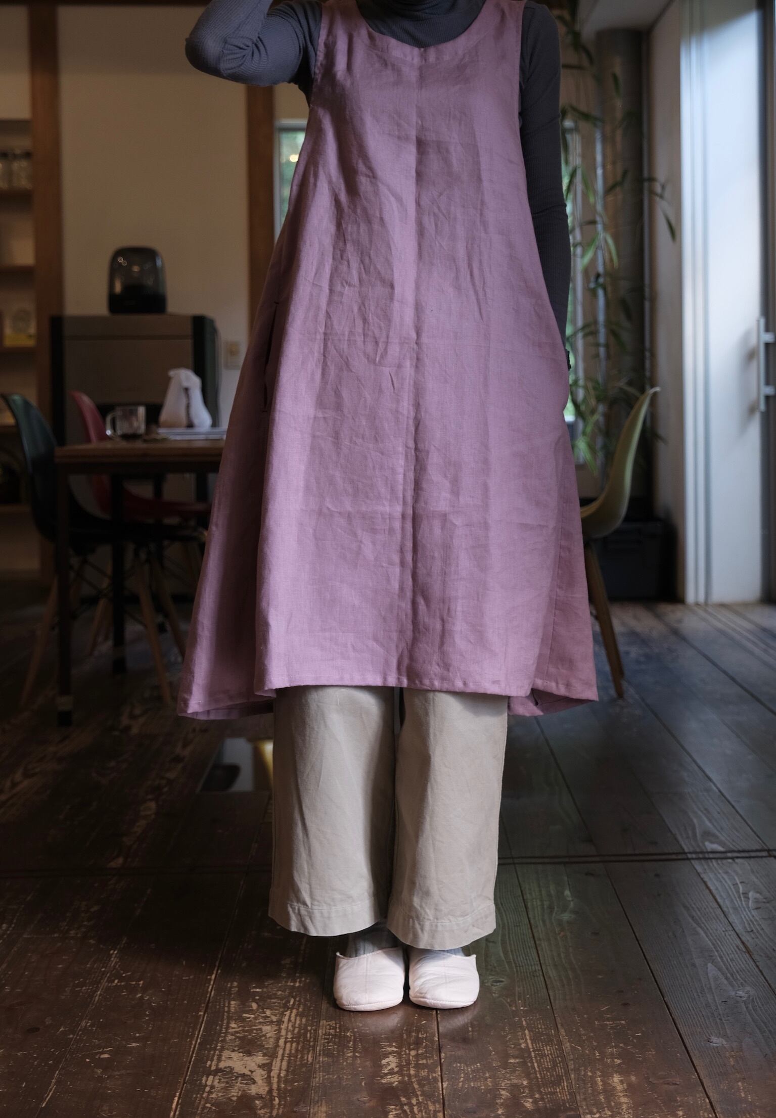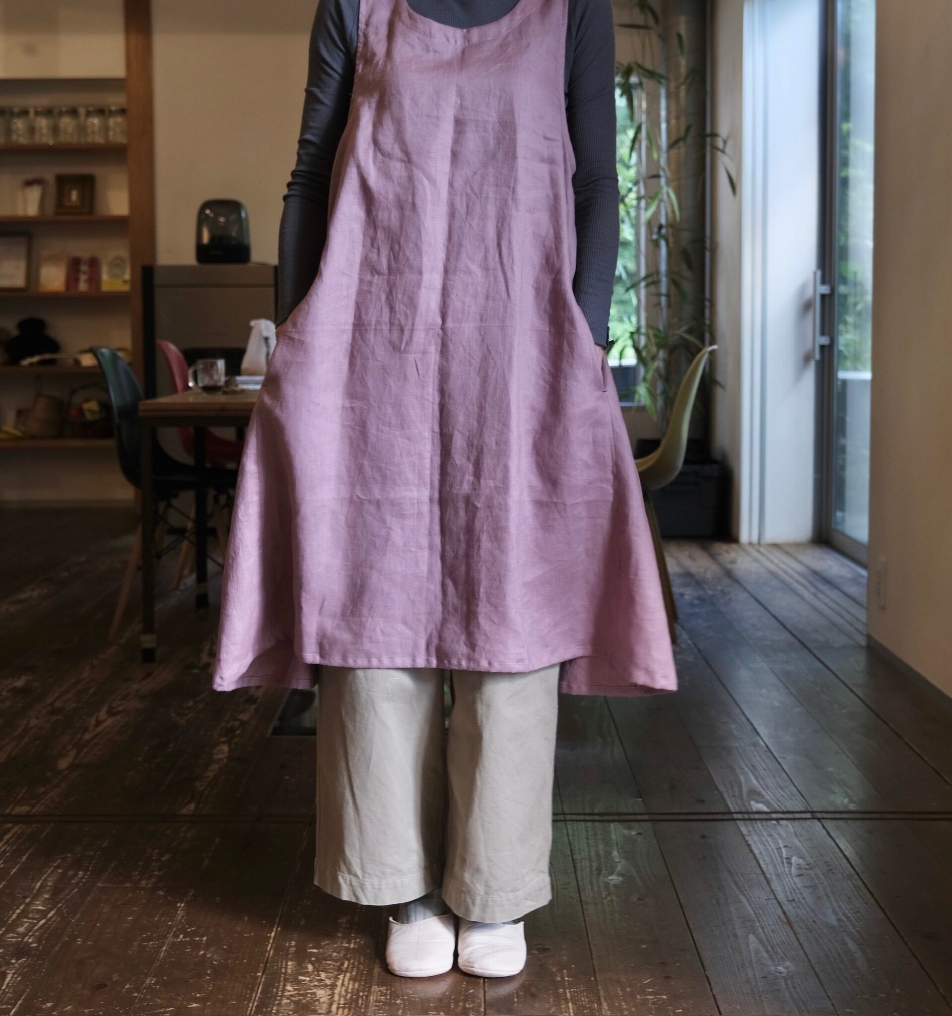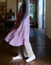 ふわっと頭からかぶるだけのワンピース風エプロン。