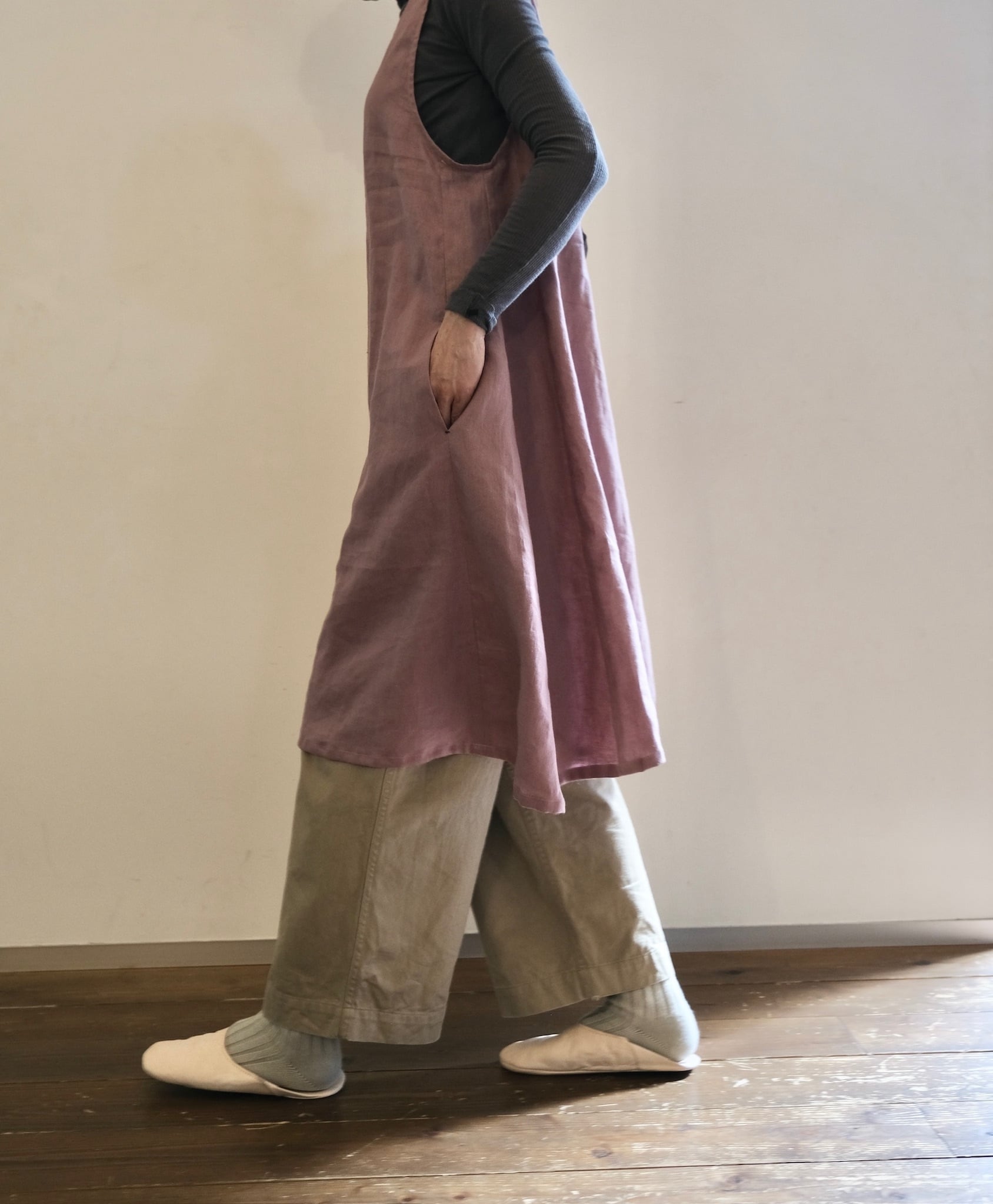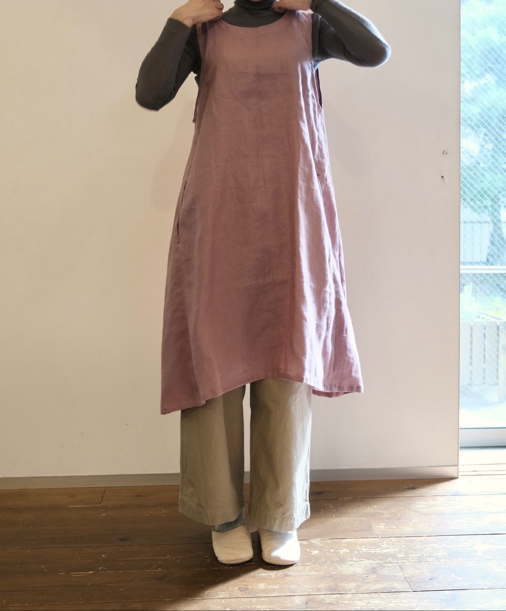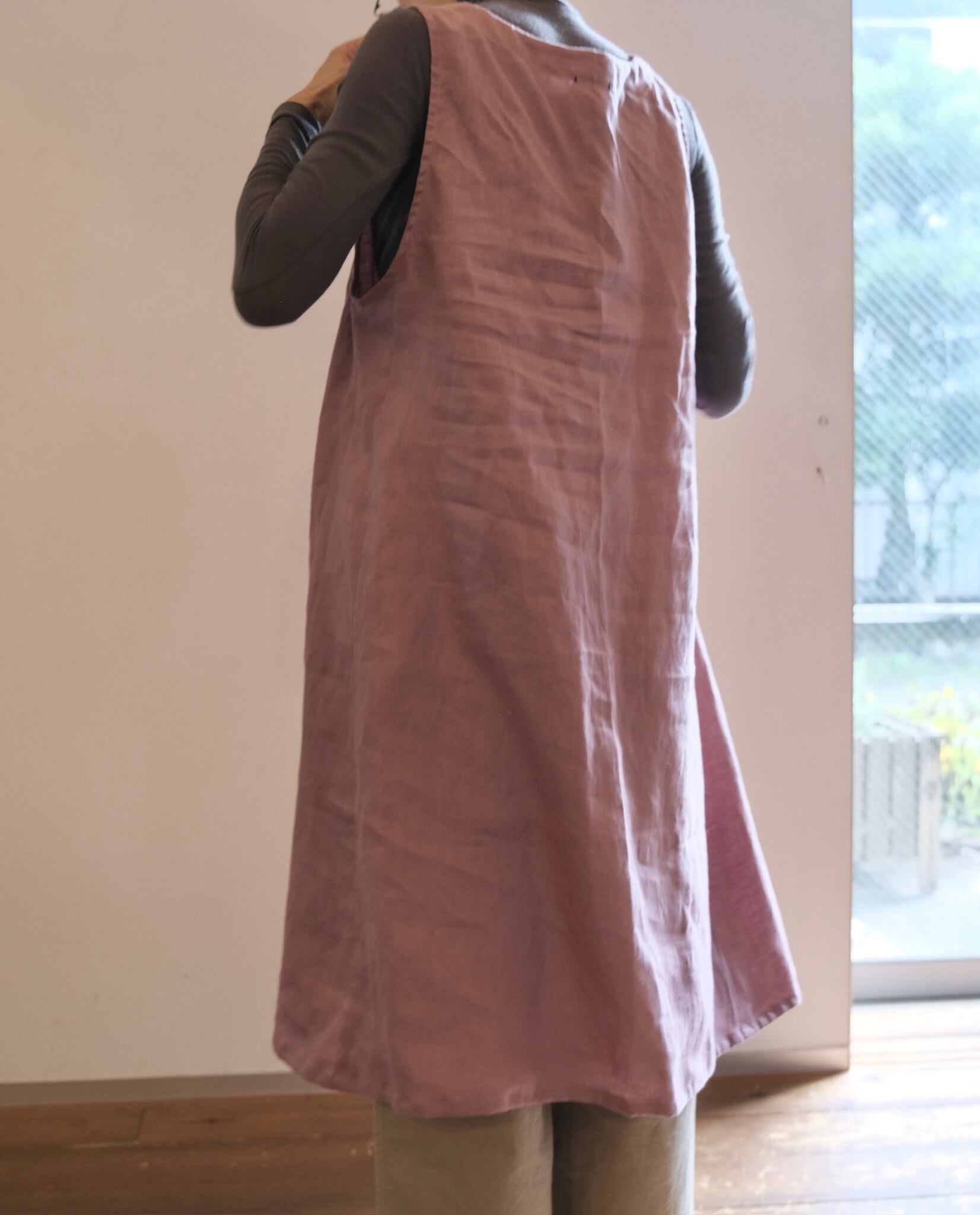 ふわっと頭からかぶるだけのワンピース風エプロン。