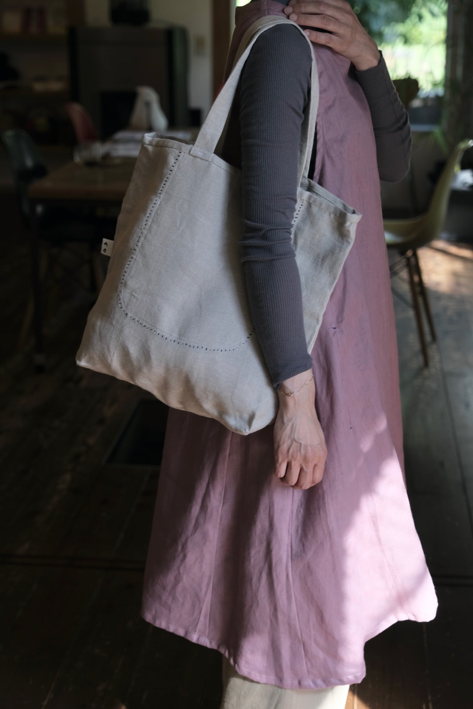 厚めのリネン一枚仕立てで、内側にポケットが一つ付いています。