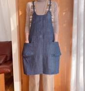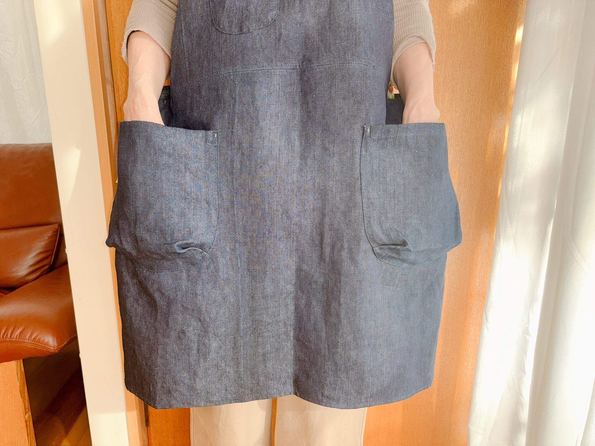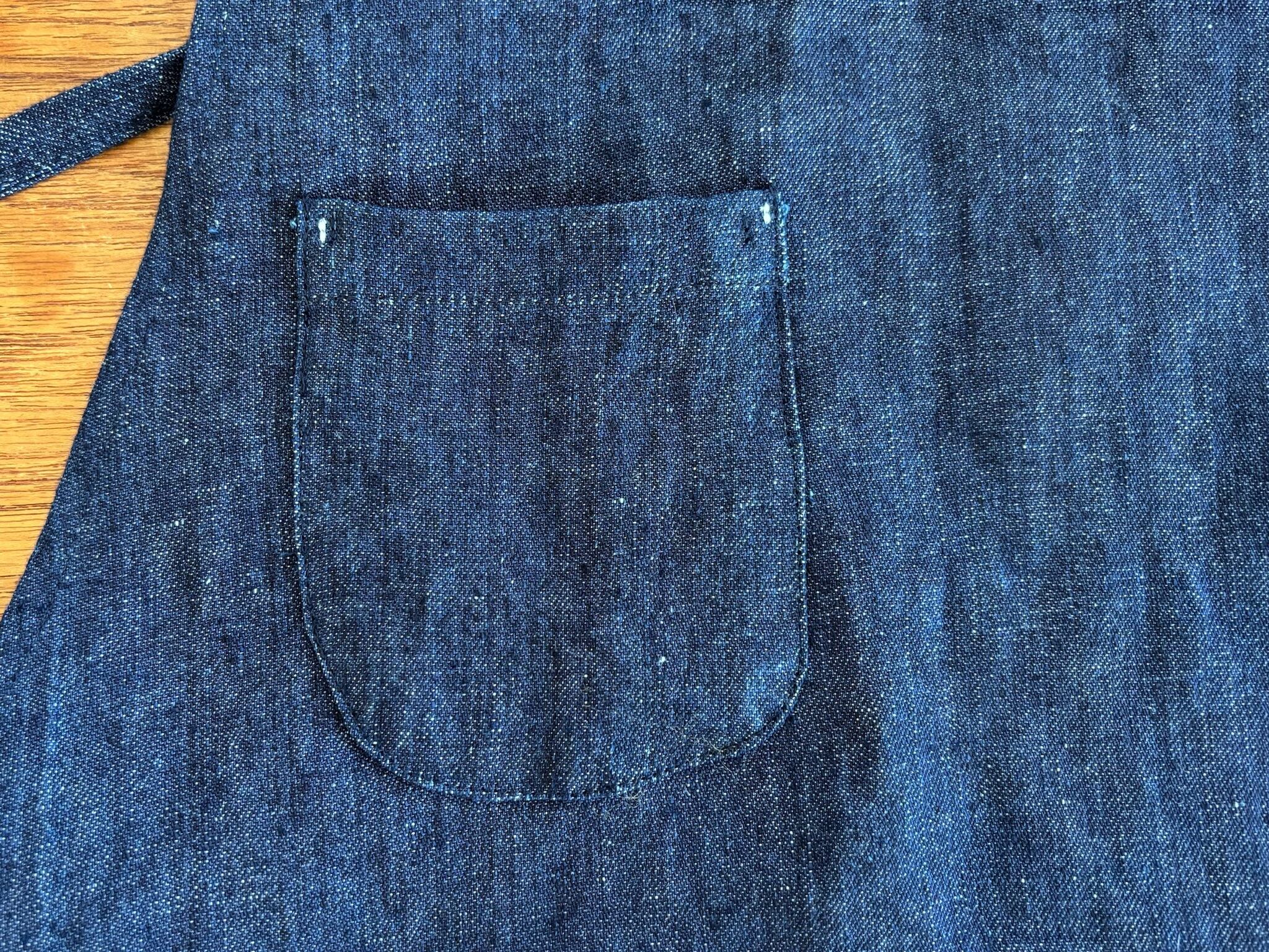 短めの丈に丸みを帯びた裾、お山ふたつの胸あてとぷっくりとしたポケットが特徴的なデザインです。