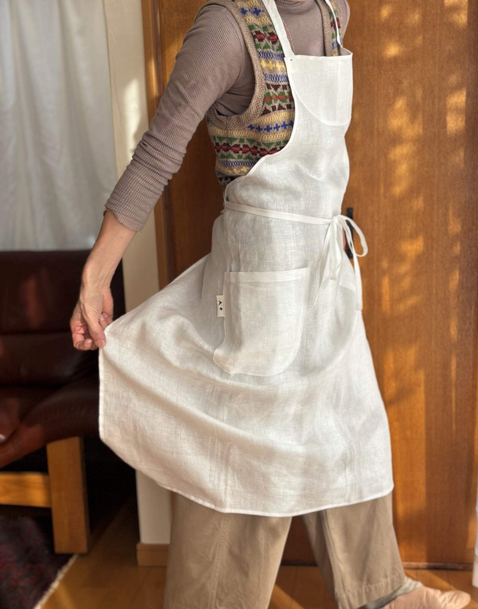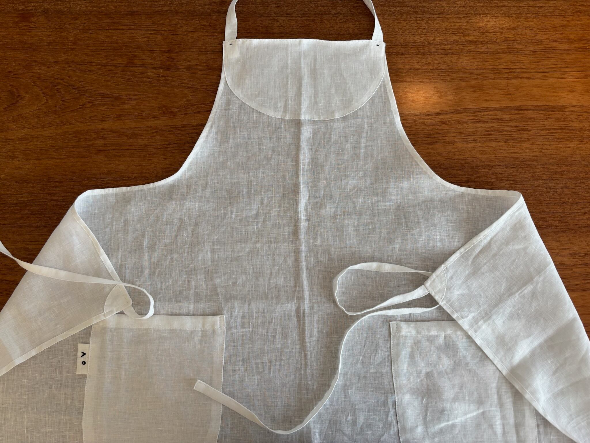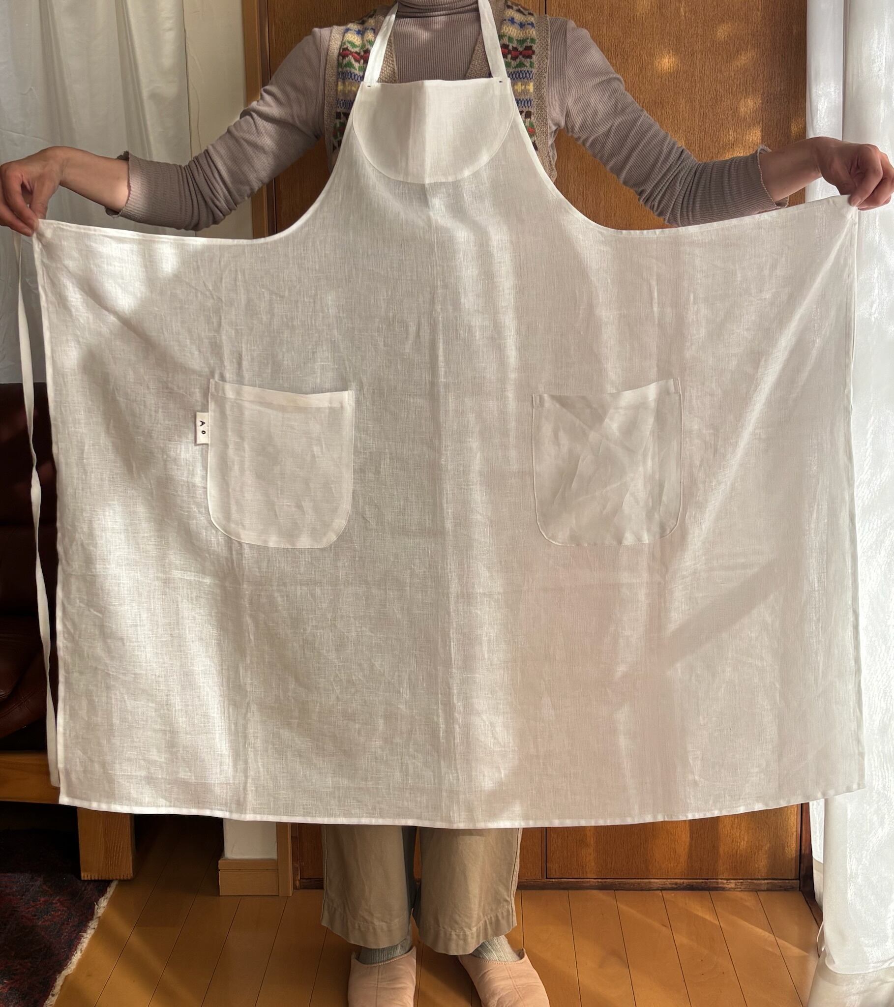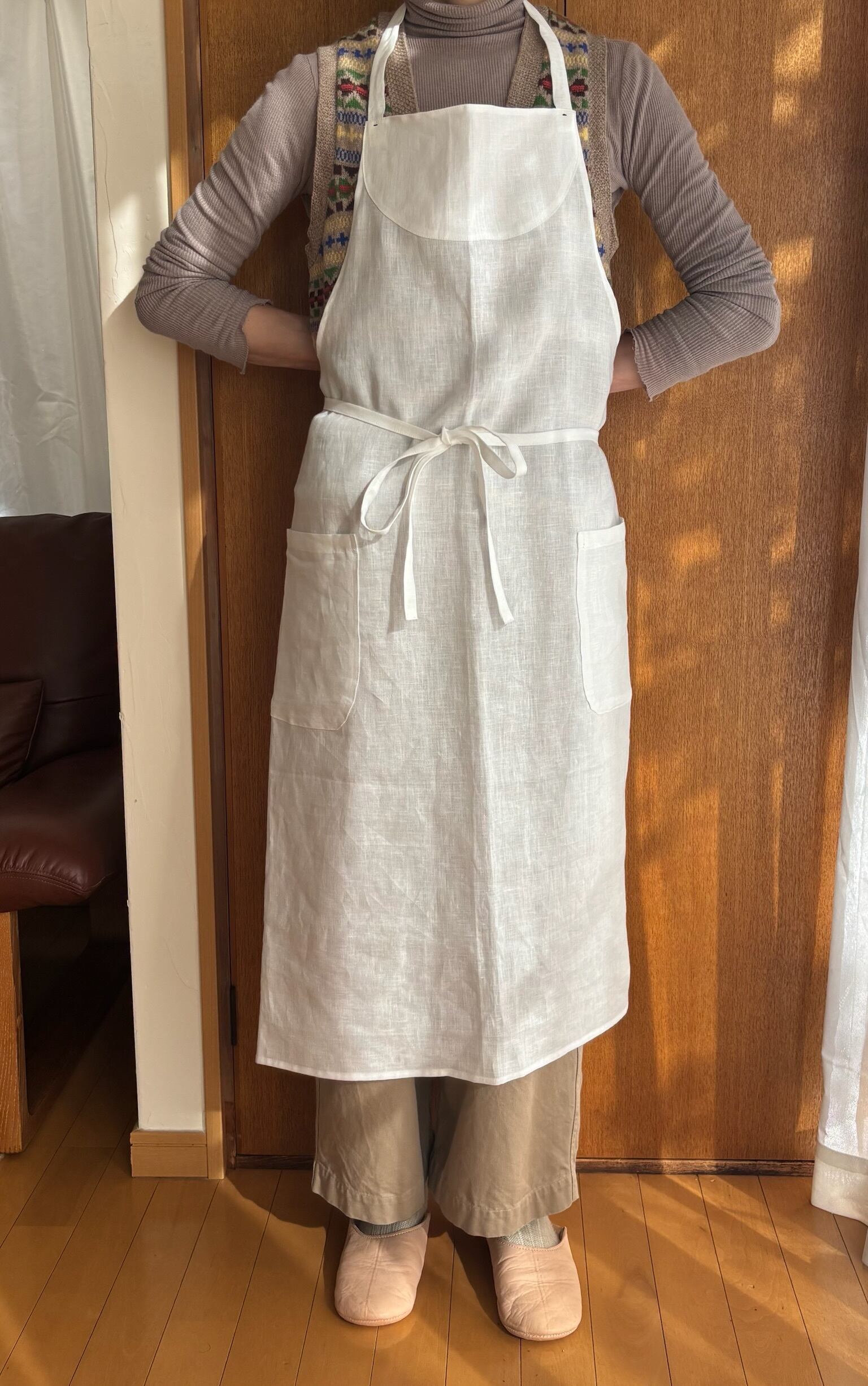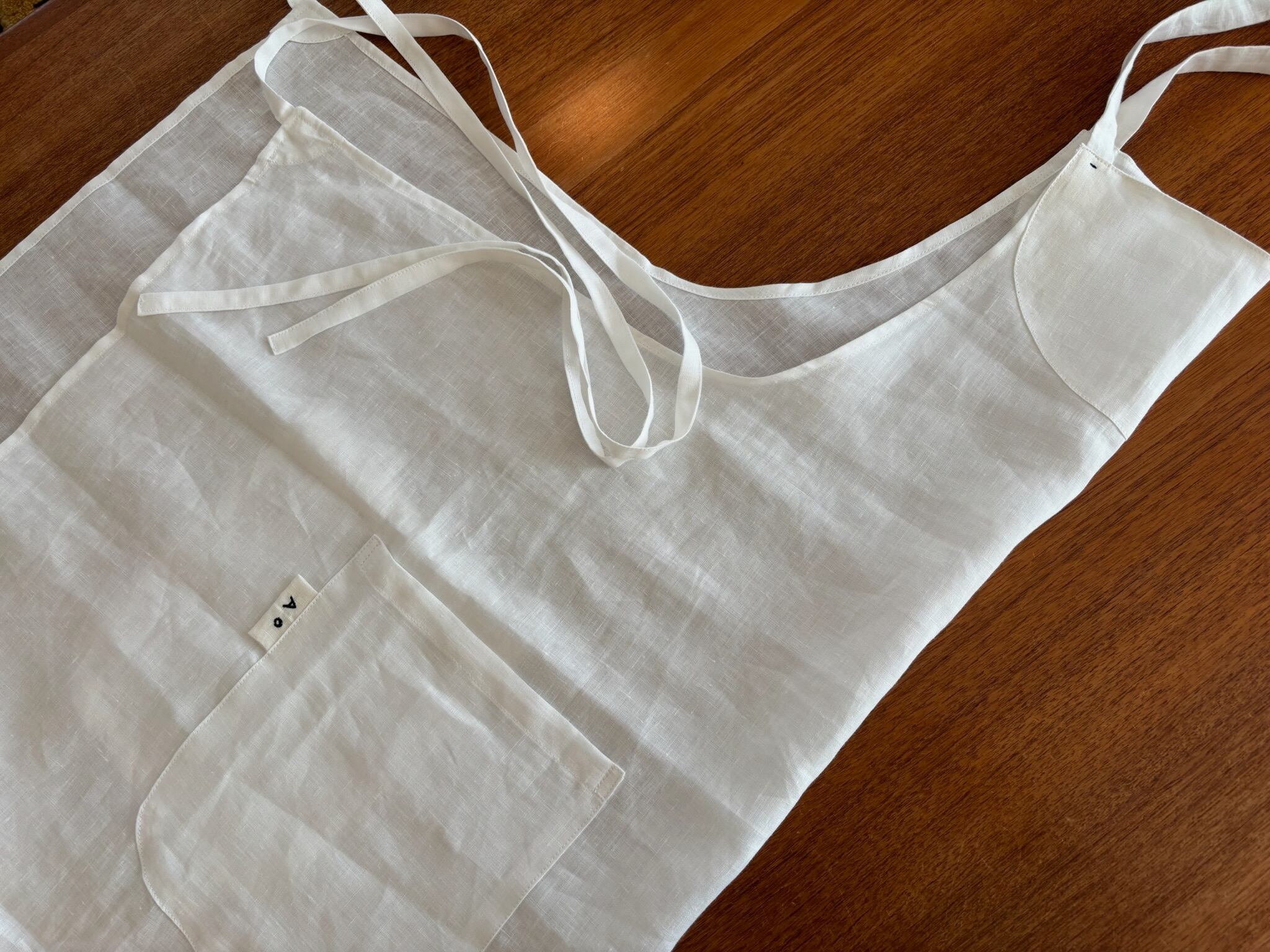 まっさらな白いリネンのエプロン。薄目の生地が優しく柔らかな雰囲気を醸します。