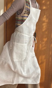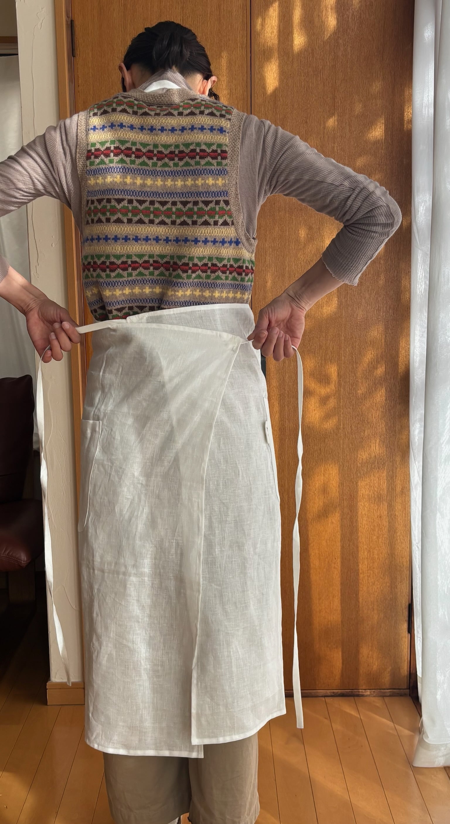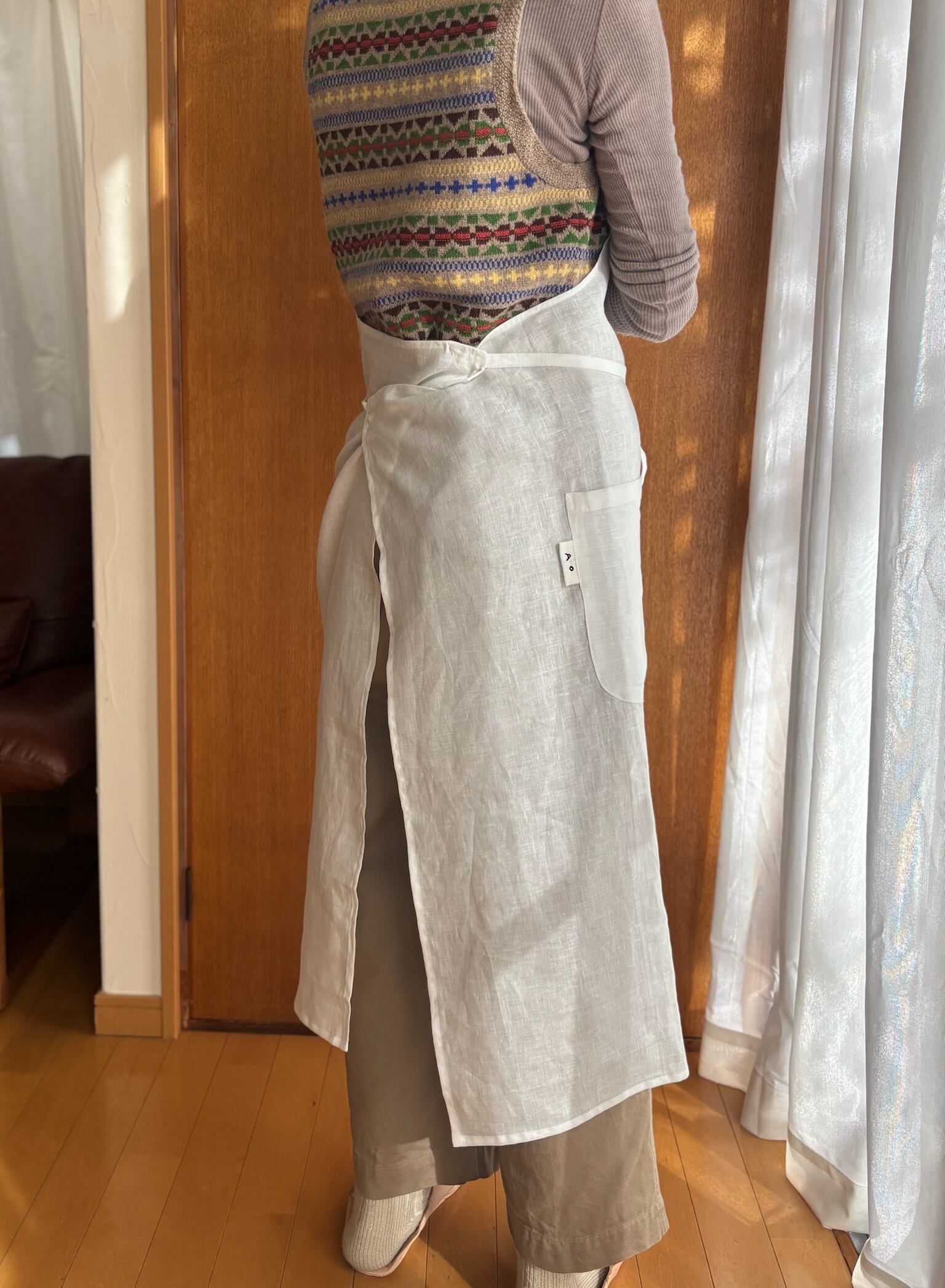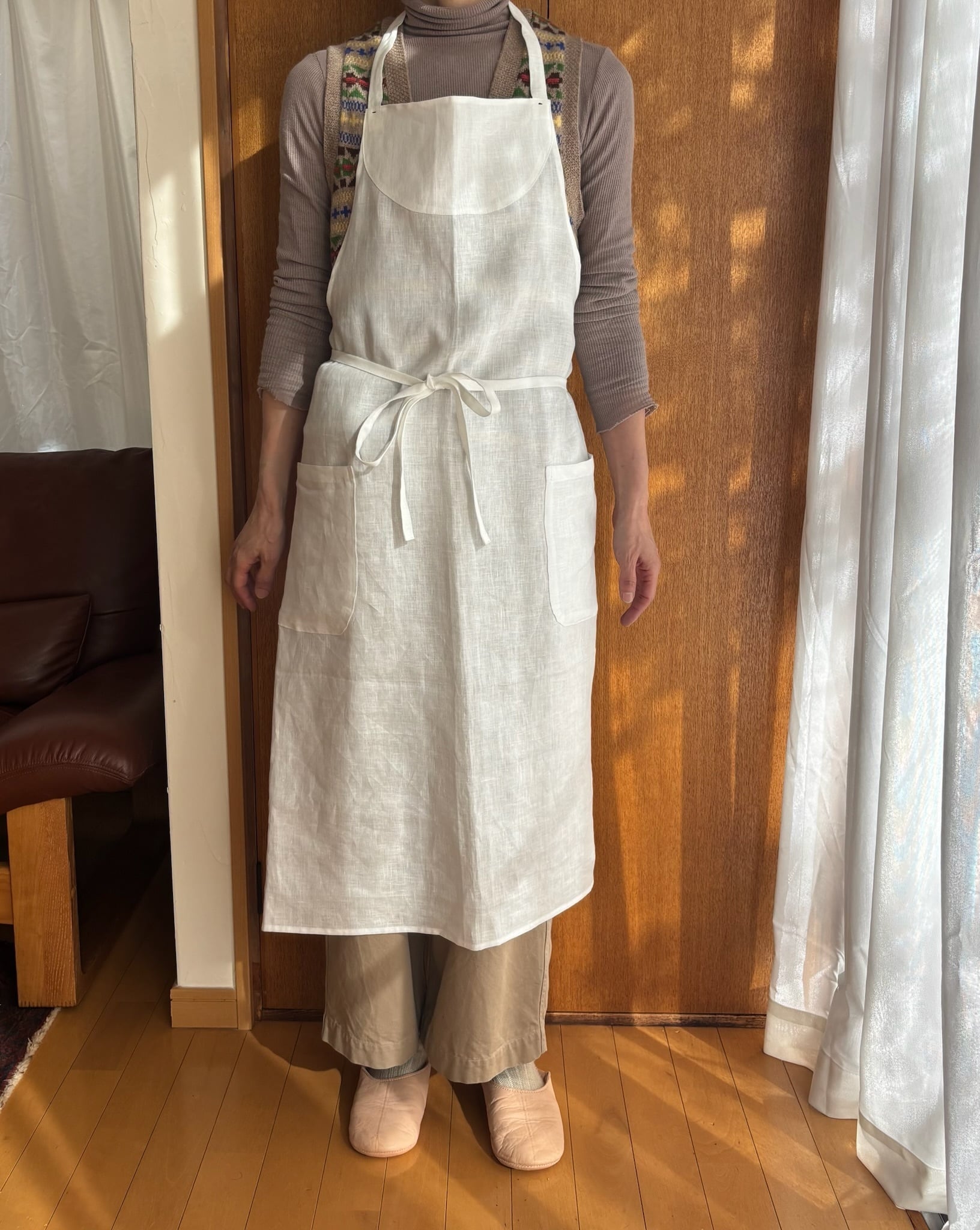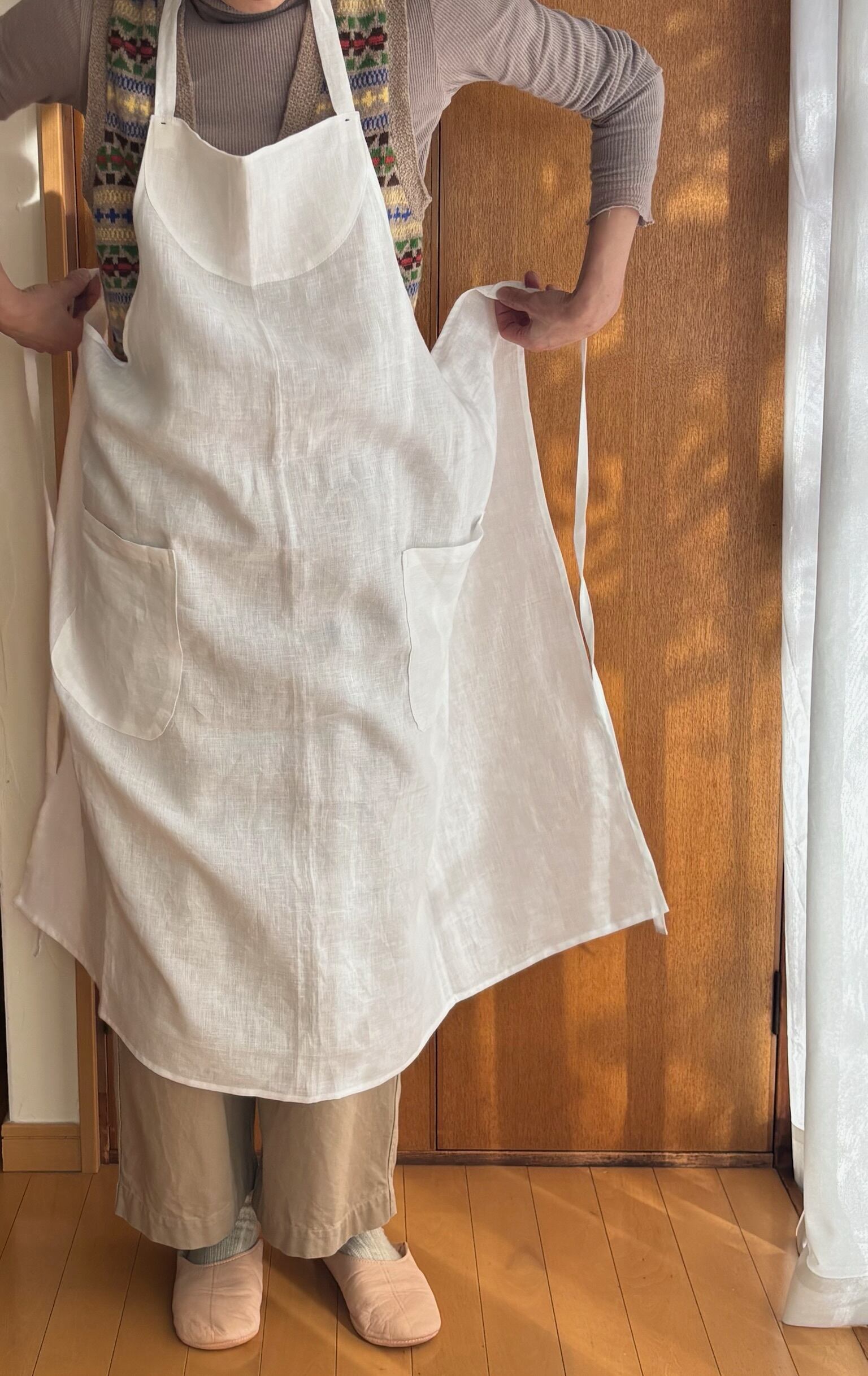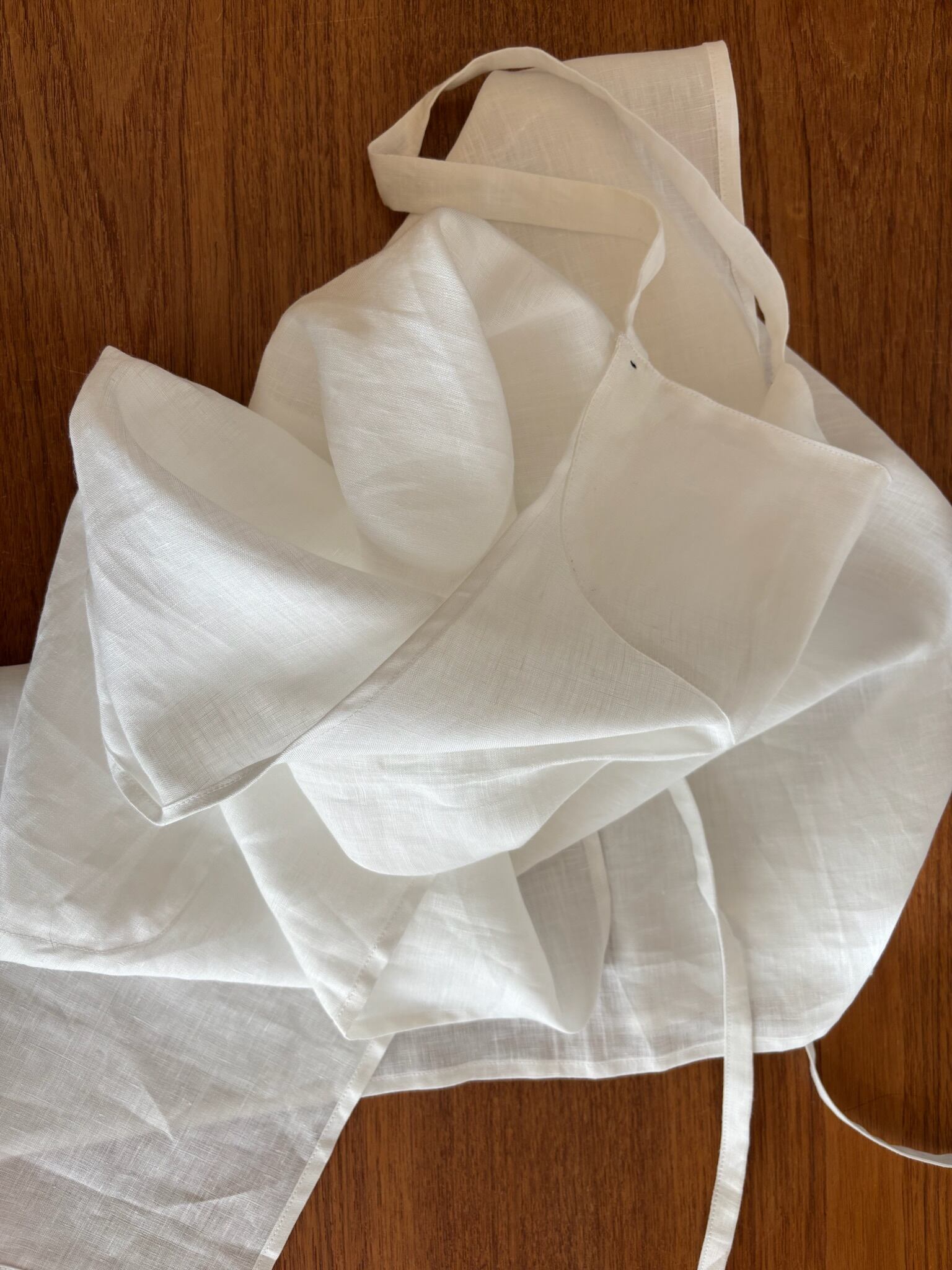まっさらな白いリネンのエプロン。薄目の生地が優しく柔らかな雰囲気を醸します。