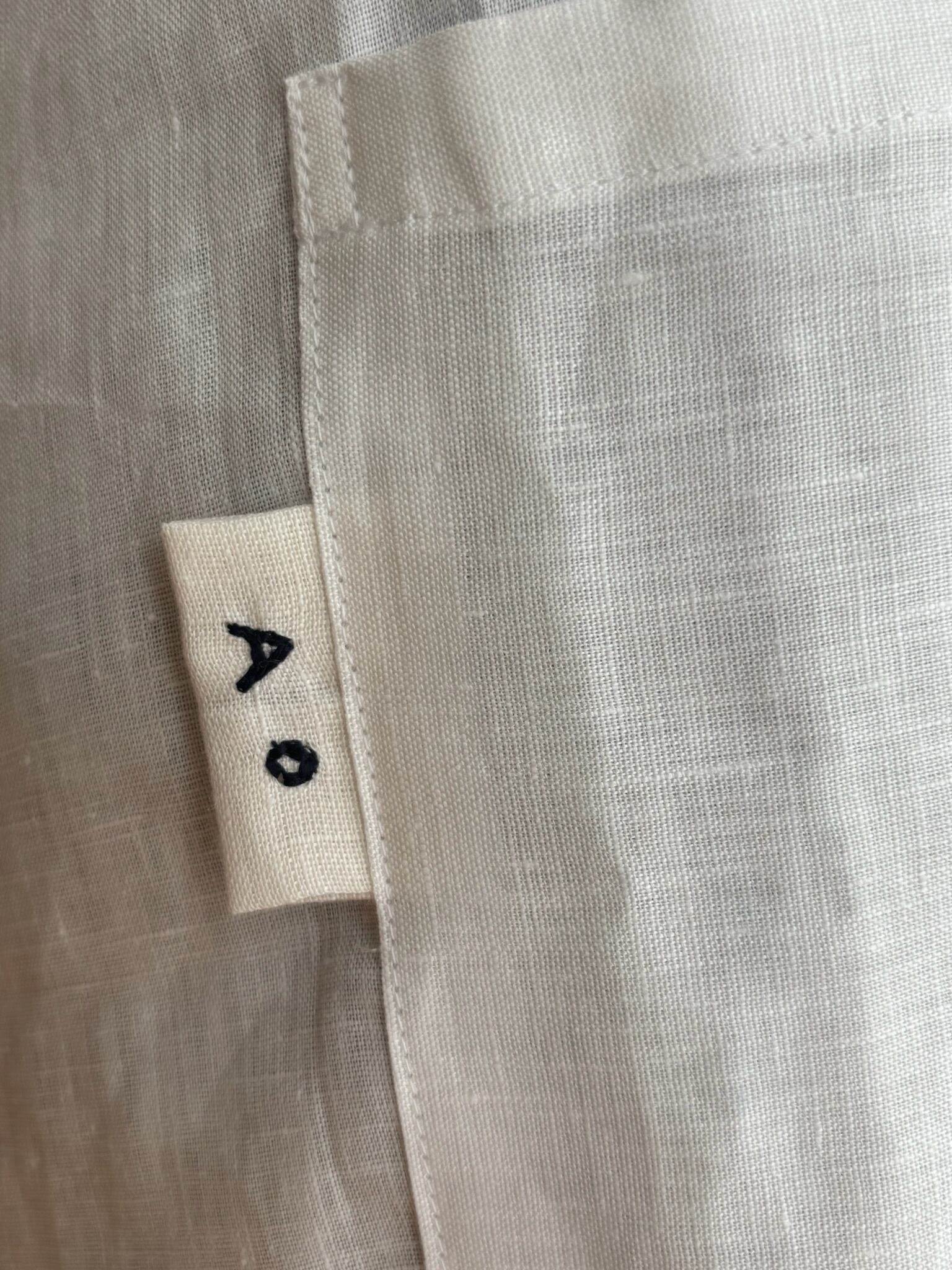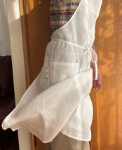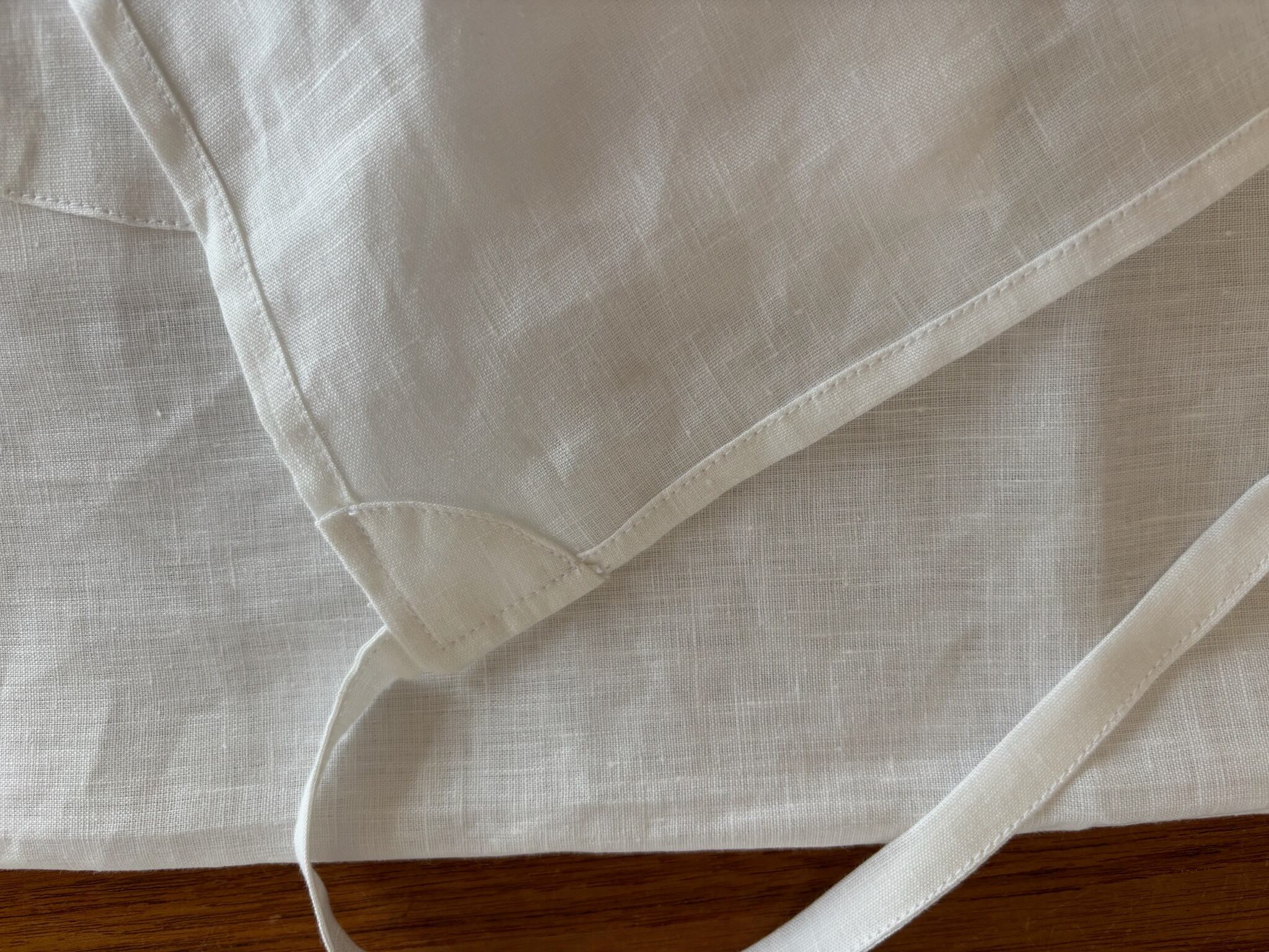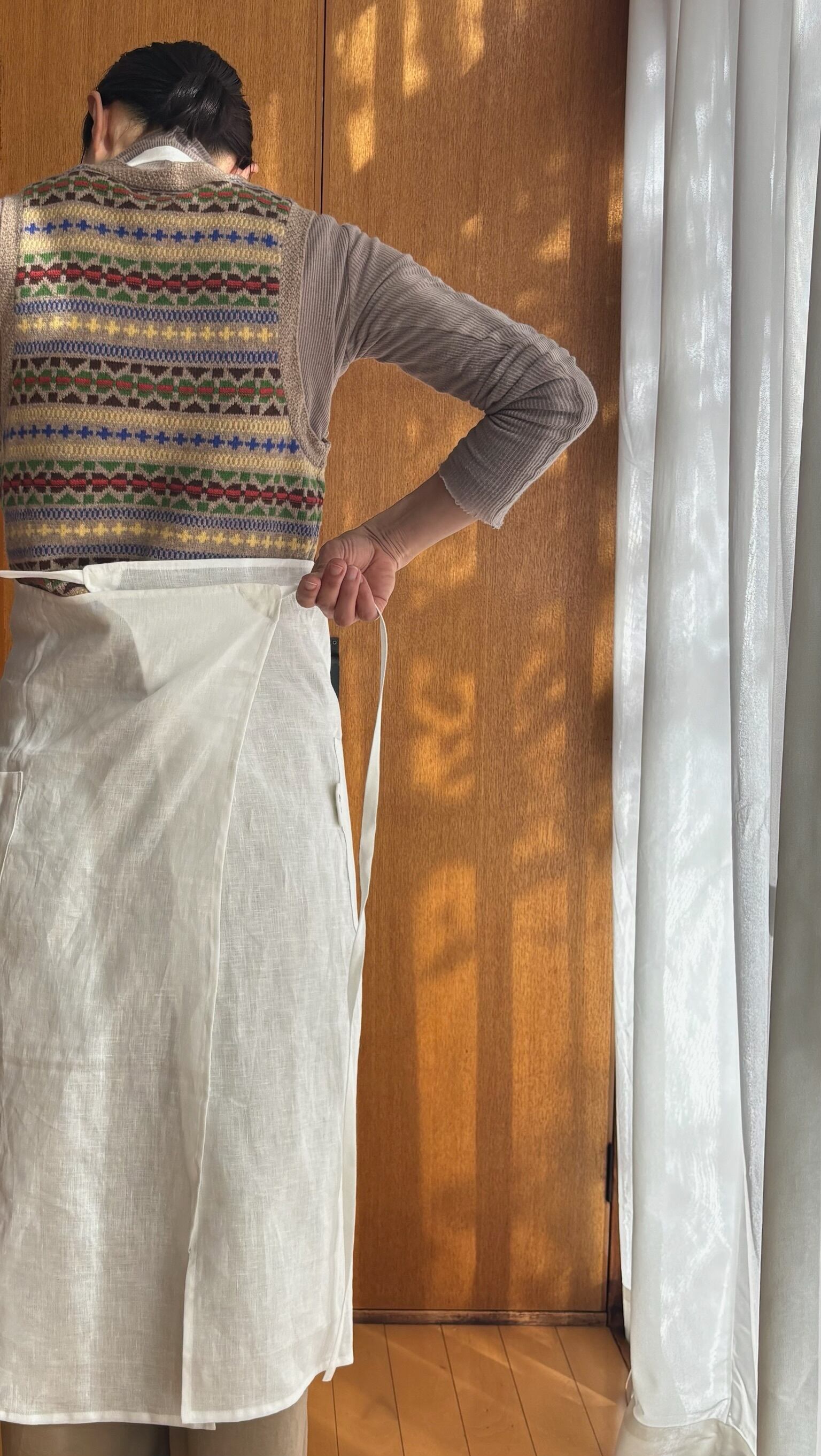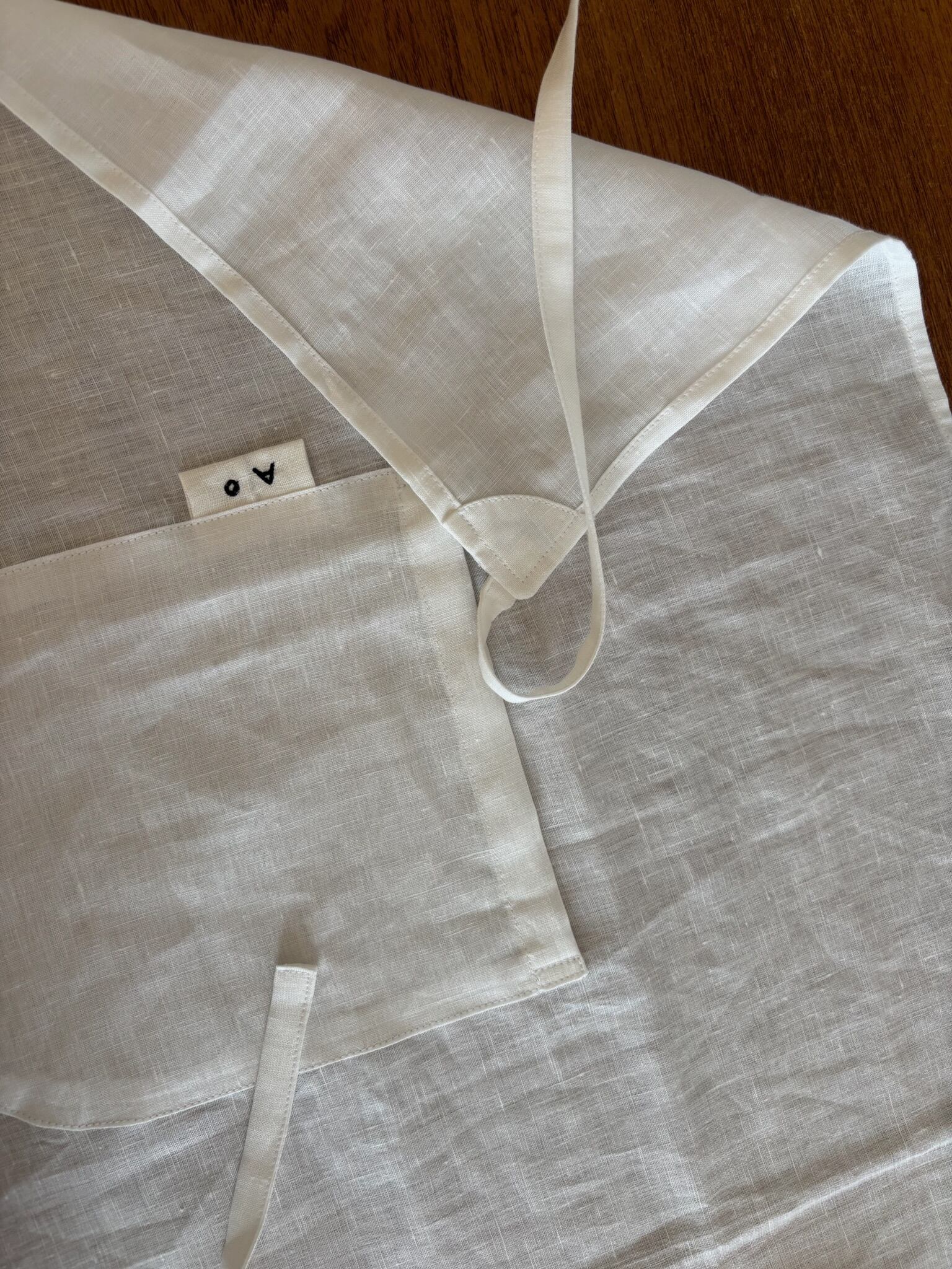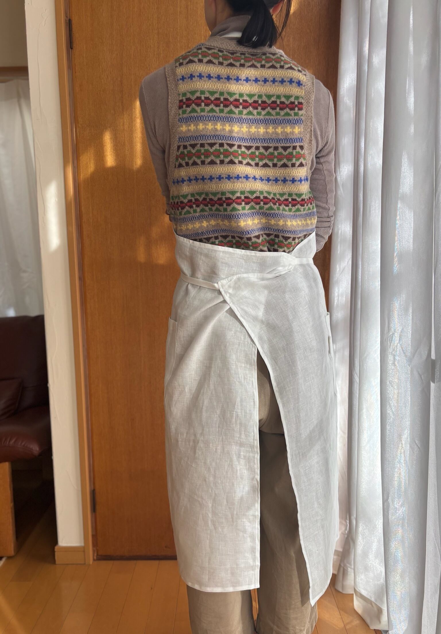 まっさらな白いリネンのエプロン。薄目の生地が優しく柔らかな雰囲気を醸します。